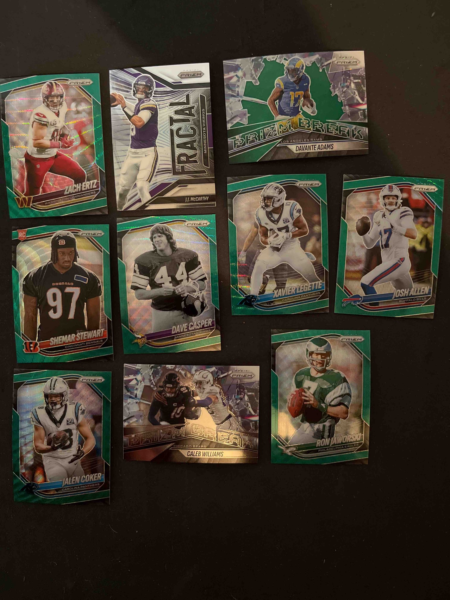 This is a collection of nine modern NFL trading cards from the Panini Prizm series, primarily 2024 releases. The lot includes seven 'Green Pulsar' parallel cards featuring a distinct textured, wavy holographic background in a vibrant emerald green. These parallels feature players Zach Ertz, Shemar Stewart (RC), Dave Casper, Xavier Legette (RC), Josh Allen, Jalen Coker (RC), and Ron Jaworski. Additionally, the collection contains two 'Prizm Break' inserts: one featuring Davante Adams (mislabeled as Rams/Adams mix) and a dual-player insert featuring Caleb Williams. One 'Fractal' insert of J.J. McCarthy is also present. The cards are standard 2.5 by 3.5 inches, constructed from high-quality thick cardstock with a glossy, refractor-style finish known for its 'Prizm' chrome technology. Visually, the cards appear to be in 'Near Mint' condition with sharp corners and clean edges, though they are currently unsleeved which increases the risk of surface scratching. The printing is crisp with official NFL and NFLPA licensing logos visible. Notable rookie cards (RC) like Caleb Williams, J.J. McCarthy, and Xavier Legette add significant interest to this specific grouping due to their high demand among collectors. The craftsmanship is typical of modern high-end Panini production, featuring complex die-cut designs on some inserts and layered holographic foiling.