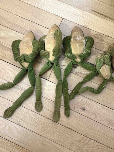 This lot features four vintage plush bean-bag style frogs, likely manufactured by the renowned German toy maker Steiff, dating approximately to the 1950s or 1960s. These items are characterized by their articulated, elongated limbs and soft, two-tone construction. The dorsal (upper) sides are crafted from a vibrant forest green velvet or moleskin material, while the ventral (under) sides consist of a contrasting beige or off-white twill fabric. Each frog measures approximately 8-10 inches in length. The construction displays high-quality hand-stitched details, particularly visible in the webbed feet and the shaping of the heads. Regarding condition, the items show significant signs of age and play wear. There is noticeable matting and thinning of the green velvet pile, particularly around the joints. The beige undersides exhibit substantial discoloration, staining, and visible fraying at the seams where the limbs attach to the bodies. One specimen appears to have stuffing loss or internal degradation near the neck area. No identifying metal ear buttons (Knopf im Ohr) or yellow tags are immediately visible in this view, which is common for played-with toys of this era where tags were often removed. The aesthetic is representative of mid-century European soft toy design, favoring semi-realistic anatomical features combined with whimsical flexibility.