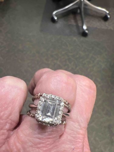 This jewelry ensemble features a central emerald-cut diamond ring, accented by a halo of smaller round-cut stones, set atop multiple thin bands. The main stone presents a classic step-cut rectangular silhouette with distinct linear facets that emphasize clarity. The surrounding halo consists of approximately twenty small, round diamonds or high-quality stimulants prong-set in a radiant border. The metal appears to be white gold or platinum, exhibiting a cool, silver-toned luster. The ring is worn as part of a stacked set, which includes at least two additional 'eternity' or semi-eternity style bands featuring a textured, twisted, or bead-set design, alongside a singular smooth, polished band. The construction suggests a modern contemporary style, likely manufactured within the last 15-20 years. Close inspection of the center stone reveals some visible surface debris or minor oils, which is common for emerald cuts due to their large flat tables, but the facets remain sharp. No specific maker's marks or hallmark stamps are visible in the photograph, but the uniformity of the settings points to professional craftsmanship. The overall condition appears excellent with no visible missing stones or significant deformation of the bands.