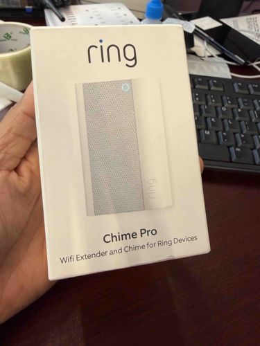 This item is the original retail packaging for a Ring Chime Pro, a dual-purpose Wi-Fi extender and chime designed for use with Ring doorbells and security cameras. The box is rectangular and constructed from high-quality, lightweight white cardboard with a matte finish. On the front panel, the 'ring' logo is printed in a minimalist black sans-serif typeface at the top. Below the logo is a high-resolution graphic of the device itself, which features a modern, fabric-like grey mesh texture and a discreet blue LED indicator ring on its upper right corner. At the bottom of the box, the product name 'Chime Pro' is prominently displayed, followed by the descriptive text 'Wifi Extender and Chime for Ring Devices'. The packaging represents contemporary sleek industrial design typical of modern smart home technology. Visible condition issues include slight scuffing and minor indentations along the bottom edge and corners, likely from shelf wear or handling. The box appears to be in overall good condition, though it has been opened as evidenced by the lack of original plastic shrink-wrap and some slight deformation near the top opening flap. This generation of the device was introduced around 2020, characterized by its plug-in design and built-in nightlight feature.