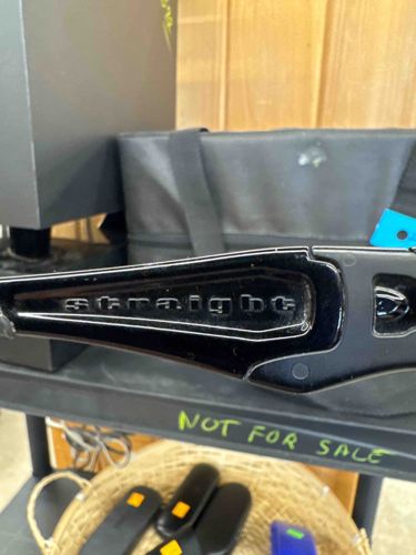 This item is a pair of Oakley Straight Jacket sunglasses, likely an early 2000s iteration or 'New Straight' model based on the bridge and temple design. The frame is constructed from Oakley’s proprietary 'O-Matter' material, which is a lightweight and durable stress-resistant plastic, shown here in a gloss black finish. The temple arm features the word 'STRAIGHT' in a raised, molded sans-serif typeface centered within a sculpted geometric recess, a hallmark of the brand's industrial design language from that era. The hinge area shows a wrap-around aerodynamic construction designed for sports and high-activity use. In terms of condition, the gloss finish exhibits visible surface micro-scratching and some minor edge wear consistent with age and regular handling. There are small white specks and dust accumulation in the crevices of the lettering and hinges, suggesting they have been stored in a dusty environment. The build quality reflects typical Oakley high-performance standards with thick, molded components and integrated hinges. No specific maker's marks besides the model branding are visible in this specific view, but the design is indicative of the late 1990s to early 2000s eyewear trends focused on wrap-style frames.