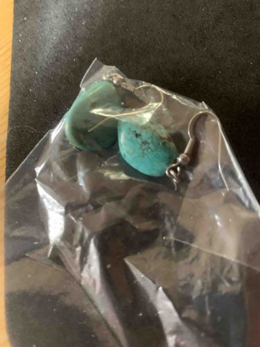 A pair of dangle or drop style earrings featuring free-form turquoise stones. The stones exhibit a vibrant robins-egg blue to teal hue with significant natural matrix—brown and black mineral veins that create a spiderweb-like pattern across the surface. The stones appear to be roughly tumbled rather than precisely faceted, giving them a rustic, organic aesthetic. Each stone is suspended from a metallic French hook (fishhook) ear wire, which includes a decorative coil and bead at the base of the loop. The metal lacks visible hallmark stamps, typically suggesting a base metal or possibly sterling silver consistent with Southwestern style jewelry. Based on the construction and findings, these are likely contemporary fashion pieces or artisan-crafted items from the late 20th to early 21st century. The condition appears fair to good with no immediate chips visible on the stone surfaces, though they are currently encased in a clear plastic protective bag which obscures fine surface scratches. The scale suggests a length of approximately 1 to 1.5 inches.