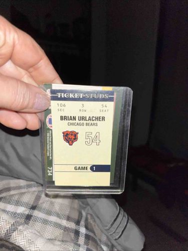 This is a year 2000 football trading card featuring Brian Urlacher of the Chicago Bears, specifically the 'Ticket Studs' insert from the Upper Deck Victory series. The card is designed to mimic the appearance of a vintage game ticket stub, featuring an off-white/cream background with a centered layout. Detailed on the card are specific stadium seating notations (SEC 106, ROW 3, SEAT 54) along with the player's name, team name, and jersey number (54). A small Chicago Bears logo is located on the left side. The card is standard 2.5 x 3.5 inch dimensions and is currently housed in a clear plastic protective top-loader. The card edges appear generally crisp from this view, though it is placed inside a thicker green bordered card or sleeve which provides a layered visual effect. The condition appears to be well-preserved without obvious creases or surface scratches visible through the plastic, though a precise grading would require inspection of the corners and reverse side. The '1999' or '2000' copyright information can be seen on the narrow left vertical margin, identifying it as an official NFL licensed product from the early tenure of the future Hall of Fame linebacker's career.