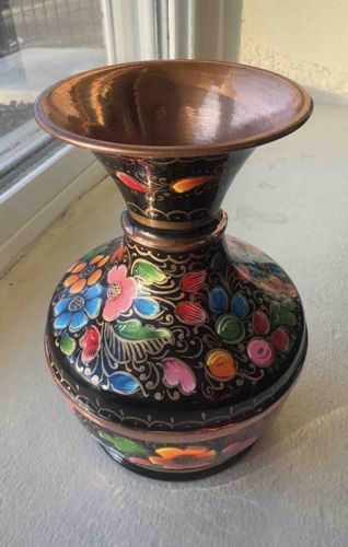 This item is a decorative vase constructed from hammered copper, featuring heavy hand-painted enamel ornamentation known as Meenakari, likely originating from Iran or India. The vase features a flared, trumpet-style rim that reveals the raw, polished copper interior, leading down to a constricted neck and a bulbous, globular body. The exterior is coated in a deep black base lacquer, which serves as a canvas for vibrant floral motifs in shades of pink, blue, orange, red, and green. Intricate gold-toned scrolling and line work accents the floral patterns, providing a sense of depth and luxury. The construction shows evidence of traditional metalworking, with a rolled rim and a multi-part assembly joined at the shoulder. Regarding condition, the piece shows light surface patina on the exposed copper rim and minor scuffing consistent with age and shelf wear along the base. The enamel appears largely intact with a high-gloss finish, though some fine crazing may be present upon closer inspection. This style is characteristic of late 20th-century artisan production, showcasing a folk-art aesthetic combined with traditional metalware techniques. Such pieces are valued for their labor-intensive hand-painted details and the contrast between the warm copper and the saturated enamel colors.