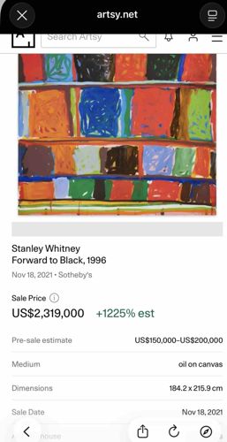This is a significant oil on canvas painting titled 'Forward to Black,' created by the renowned American abstract artist Stanley Whitney in 1996. The artwork measures approximately 184.2 x 215.9 cm (72.5 x 85 inches), showcasing Whitney's signature grid-based composition. The piece features loosely defined, stacked rectangles of vibrant, saturated colors including reds, blues, oranges, greens, and yellows, separated by thin horizontal bands of color. The brushwork is gestural and rhythmic, allowing for bleed and overlap between segments that create a sense of polyphonic movement. As a 1996 work, it represents a critical period in Whitney's career where his spatial system became more structured following his time in Rome and Egypt. The physical condition appears excellent based on auction records, with rich impasto and no visible signs of deterioration or repair. The craftsmanship is characterized by the artist's unique ability to balance color weight and light, creating a monumental visual experience that bridges the gap between American Color Field painting and European Modernism. This specific work achieved a remarkable sale price of $2,319,000 at Sotheby's in November 2021, far exceeding its original estimate and solidifying its status as a masterpiece of contemporary abstraction.