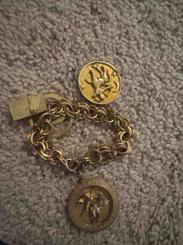 This item is a vintage charm bracelet featuring a substantial double-link chain design, commonly referred to as a double curb or spiral link, characteristic of mid-20th-century costume jewelry (circa 1950s-1960s). The bracelet is finished in a bright gold-tone plating over a base metal. It features several prominent charms: one circular pendant depicts a centaur archer for the Sagittarius zodiac sign against a textured, starry background; another large circular medallion features a central cherub or Cupid figure with the playful inscription 'I MARRIED AN ANGEL' embossed around the perimeter. A rectangular tag charm is also visible, appearing to have a textured reverse side. The construction utilizes heavy-gauge links and jump ring attachments for the charms. The condition shows moderate wear and surface scratches consistent with age, with some slight dulling of the gold finish and minor oxidation in recessed areas. The craftsmanship suggests a high-quality mass-market manufacturer from the mid-century era, designed for personal storytelling through the addition of meaningful charms. The overall aesthetic is bold and sentimental, typical of the 'classic' charm bracelet style which favors larger, statement-making charms rather than small delicate ones.