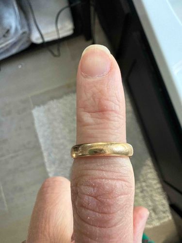 This item is a classic, high-polish domed wedding band, appearing to be crafted from yellow gold. The band features an approximate width of 4mm to 5mm, characterized by its traditional 'comfort fit' style with a rounded exterior profile. The material exhibits the characteristic rich, warm hue associated with 14k or 18k yellow gold. Regarding condition, the metal surface displays a noticeable patina of wear, including micro-scratches, small nicks, and localized dulling of the polish, which are consistent with daily long-term use. No visible maker's marks or hallmarks are identifiable from this exterior angle, though such stamps would typically be located on the interior shank. The construction appears solid and well-cast with uniform thickness throughout the circumference. This style is a perennial staple of jewelry design, making it difficult to date precisely, though its overall aesthetic aligns with late 20th-century to contemporary manufacturing. The absence of stones or ornate engravings emphasizes the purity of the metal and the simplicity of its craftsmanship.