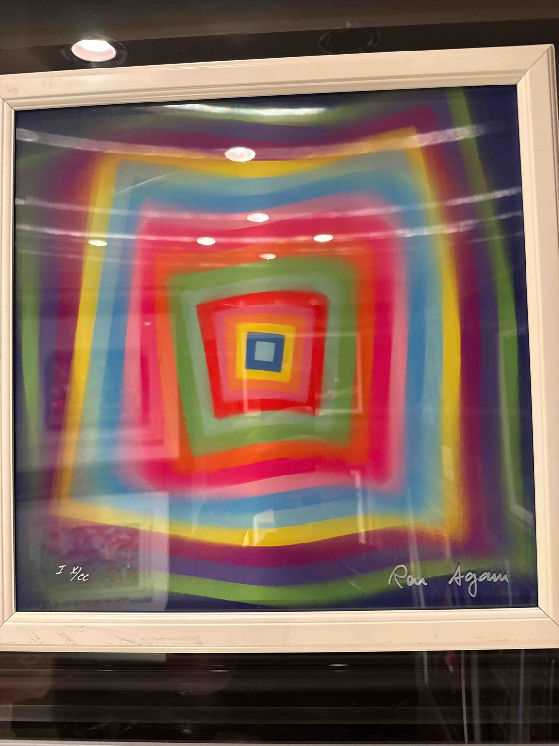 This artwork is a vibrant 3D lenticular composition by contemporary artist Ron Agam. The piece features a nested square tunnel design that creates a powerful illusion of depth through the use of a lenticular lens, allowing the image to shift and move as the viewer changes their vantage point. The color palette is a full spectrum rainbow, transitioning from a central blue square through successive layers of orange, red, green, pink, cyan, yellow, and purple. This type of 'Kinetic Art' follow in the footsteps of his father, Yaacov Agam. The piece is physically housed in what appear to be its original white-finished wooden frame under a clear protective layer which is essential for the lenticular effect. In the lower-left corner, it is hand-marked with 'I XX/CC', indicating it is part of a specific limited edition run (likely a Roman numeral edition). The lower-right corner features a prominent silver-tone or light-colored signature 'Ron Agam'. The condition appears excellent with no visible fading to the pigments; however, the lower frame edge shows some minor scuffing and dark marks, likely from handling or movement. The craftsmanship is highly precise, indicative of Agam's high-quality production standards for his multi-dimensional optical works produced in the late 20th to early 21st century.