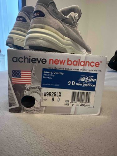 A pair of New Balance 992 athletic sneakers in the iconic 'GL' grey colorway, provided in their original packaging. These shoes feature a premium construction representative of the brand's 'Made in USA' heritage, blending high-quality pigskin suede overlays with breathable mesh underlays. The upper displays various shades of tonal grey with reflective silver accents and white lacing. The heel features the distinctive 'USA' embroidery and model branding. The midsole incorporates New Balance's ABZORB and SBS cushioning technology, visible as technical inserts, which are built into a bulky, multi-layered foam stack. The box label identifies this specific model as W992GLX, sized 9D, which is a wide width. Notably, the box features a personalized associate label ('Emery, Cynthia'), a unique touch often found on authentic factory-sourced or outlet pairs. The condition appears lightly used or deadstock; however, there is noticeable yellowing or 'ambering' on the clear gel inserts in the midsole, a common sign of oxidation and age for this model, which was originally launched in 2006 for the brand's 100th anniversary and later re-released. The overall craftsmanship is high, indicative of the domestic manufacturing line known for durability.