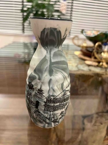 This item is a traditional Japanese sake decanter, known as a tokkuri, featuring a distinctive bulbous body that tapers to a slender neck before flaring into a small spout. The piece is crafted from ceramic with a high-contrast aesthetic. It displays a 'nerikage' or marbleized effect, where grey and white clays have been swirled together to create a fluid, smoke-like background pattern. Over this marbled base, black transfer-print graphics depict a classic Japanese landscape scene, including a woman in traditional kimono (bijin), a multi-tiered pagoda, and architectural pavilions with sloping roofs near water. The rim is finished with a solid black band, providing a clean frame for the organic swirls beneath. The construction suggests a mid-20th-century mass-production origins, likely intended for the export market or commercial use in restaurants. Condition appears excellent with no visible chips or cracks, and the glaze retains a lustrous sheen. The level of detail in the lithographic transfer indicates a moderate level of craftsmanship, typical of Japanese ceramic exports from the 1960s or 70s.