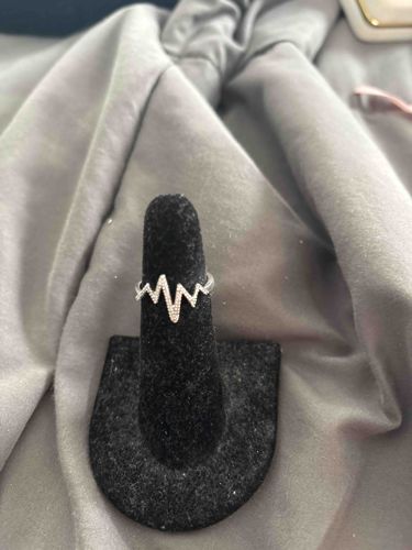 This is a contemporary fashion ring featuring a prominent 'Heartbeat' or EKG lifeline motif as the central design element. The ring is constructed from a silver-toned metal, likely sterling silver or rhodium-plated base metal, and is displayed on a black velvet finger stand. The lifeline motif is pav-set with approximately twenty to thirty small, round white stones, which are likely cubic zirconia or small accent diamonds given the modern style. The band appears to be a slim, polished round wire style that tapers slightly from the central motif. The overall color palette is monochromatic silver and white. The construction shows a sharp, angular zig-zag pattern characteristic of a cardiogram reading. Condition-wise, the item appears to be in good used condition with no visible missing stones or significant tarnish, though microscopic surface scratches on the metal are typical for pre-owned jewelry. There are no clearly visible maker's marks or hallmarks in the photo, but it represents a modern sentimental style popular in the last decade (circa 2015-present). The craftsmanship is consistent with high-street commercial jewelry production.