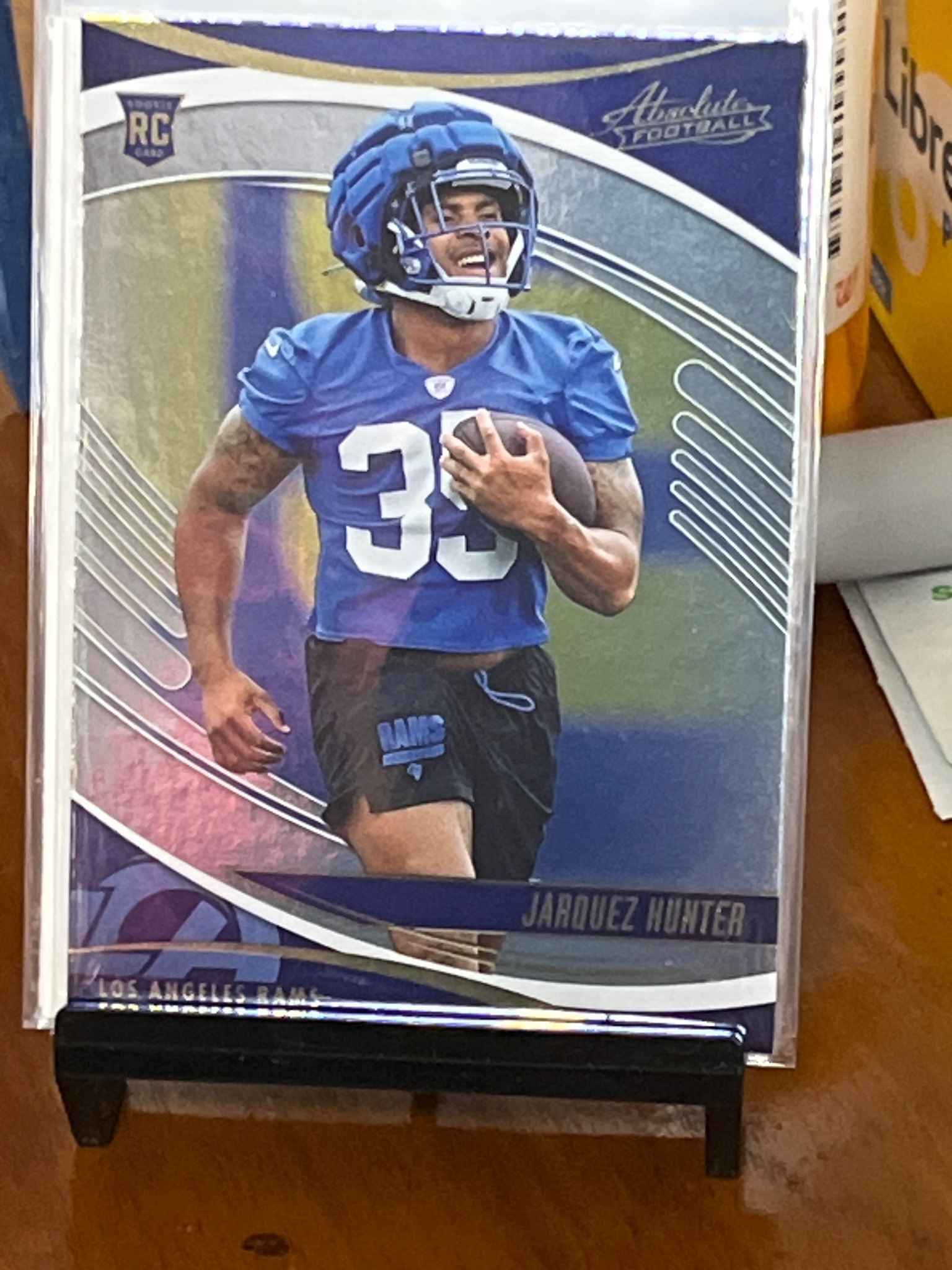 This is a modern sports trading card featuring Jarquez Hunter of the Los Angeles Rams. The card is a standard 2.5 by 3.5 inches, constructed from layered cardstock with a high-gloss finish. The front design showcases a dynamic action photo of the player in a blue practice jersey and padded helmet, clutching a football. The aesthetic utilizes a royal blue, white, and silver color palette reflective of the Rams team colors. Notable markings include the 'RC' (Rookie Card) logo in the upper left corner and the 'Absolute Football' brand logo in the upper right. The player's name, 'JARQUEZ HUNTER', is prominently displayed in a bold sans-serif font along the lower right edge, with 'Los Angeles Rams' printed just below it. The card features a distinct curved geometric design pattern on both sides of the central photograph. In terms of condition, the card is housed in a clear protective penny sleeve inside a top loader, which appears to have kept the corners sharp and the surface free of obvious scratches or dimples. The centering looks relatively balanced, though a slight shift toward the right edge is visible. There are no signs of ink fading or moisture damage. This item represents a 2024 scouting/training camp edition collectible, typical of early-release sets that use practice photography before regular-season action shots are available. The craftsmanship is high-quality, typical of Panini's mainstream Absolute product line.