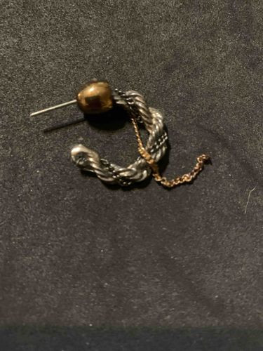 This item is a single fashion earring featuring a multi-textured, 'C-shaped' hoop design. The primary body of the earring consists of a thick, twisted cable or 'rope' motif crafted in a bright silver-toned metal, likely rhodium-plated brass or sterling silver. Intertwined with this main cable is a secondary, thinner dark gunmetal or blackened chain that adds visual contrast. Additionally, a fine-link gold-toned chain is wrapped around the hoop and extends as a decorative dangle, contributing to a contemporary mixed-metal aesthetic. The earring is a post-back style, secured by a large, spherical bronze or brass-toned clutch. The hardware is consistent with mass-market fashion jewelry from the 2010s to the present. The condition appears fair to used; there is visible tarnishing on the post and metal surfaces, and the gold-tone plating shows slight wear. The craftsmanship is industrial, utilizing braided wire techniques common in designer-inspired boutique jewelry. No maker's marks or fineness stamps are visible in the photograph, suggesting it is a non-precious costume accessory.