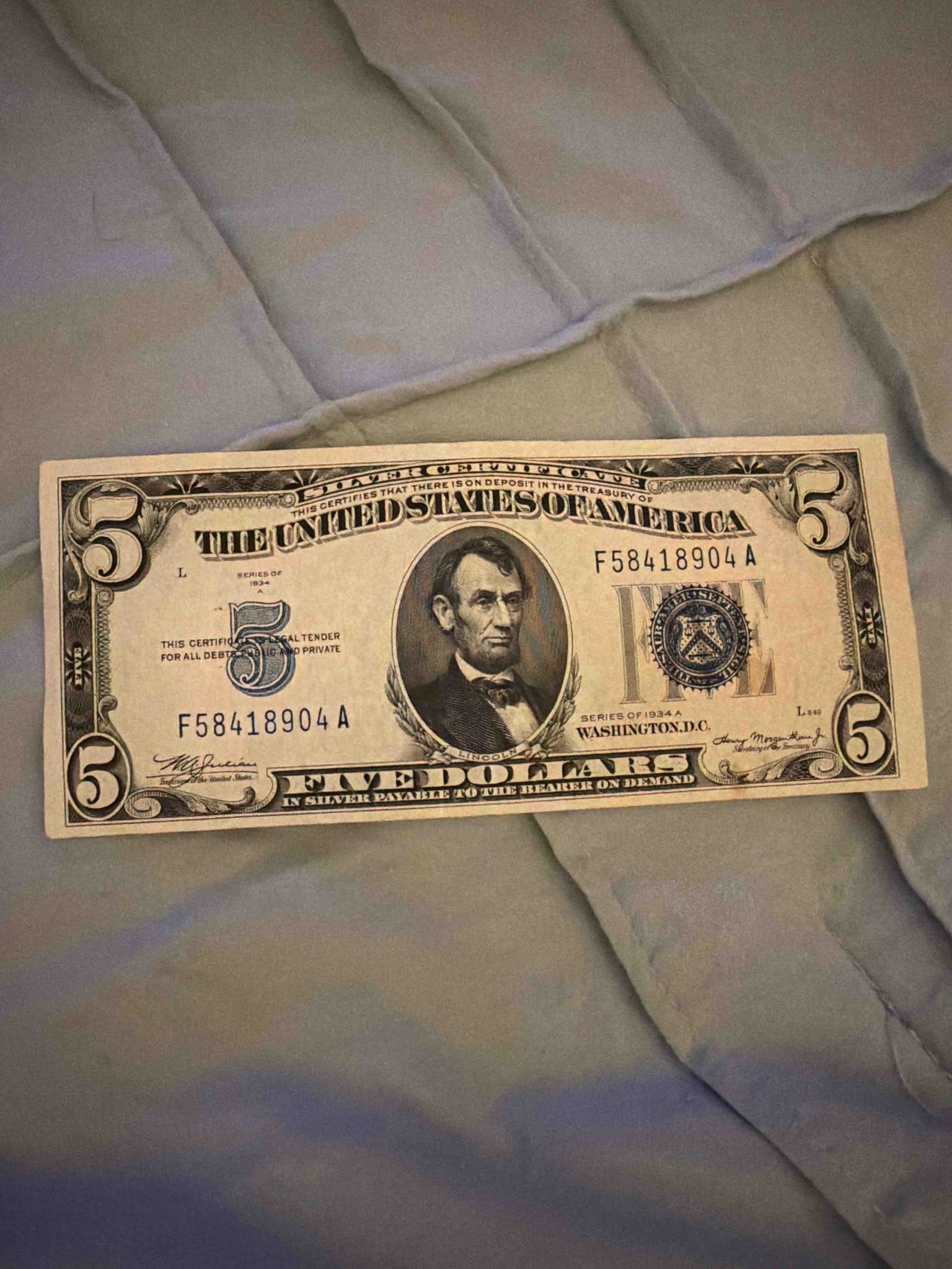 A United States five-dollar Silver Certificate from the Series of 1934 A. The note features the iconic portrait of Abraham Lincoln centered in an oval frame. This specific issue is distinguished by its vibrant blue Treasury seal located on the right side and matching blue serial number (F58418904 A) and numerical '5' denominations on the left. The top of the note bears the text 'Silver Certificate' and states that it was 'payable to the bearer on demand' in silver. The signatures belong to W.A. Julian (Treasurer of the United States) and Henry Morgenthau Jr. (Secretary of the Treasury). Physically, the bill shows signs of circulation including several vertical folds and light surface soiling, but the paper retains relatively crisp edges and no major tears are visible in the image. The engraving detail remains sharp, indicative of high-quality intaglio printing typical of the U.S. Bureau of Engraving and Printing during this era. The color of the blue ink is particularly well-preserved, adding to its numismatic appeal. The serial number block is 'F-A', and the plate numbers visible are 'L' and 'L349'. This note represents the transition period of American currency when paper money was still directly backed by silver bullion held in the Treasury.
