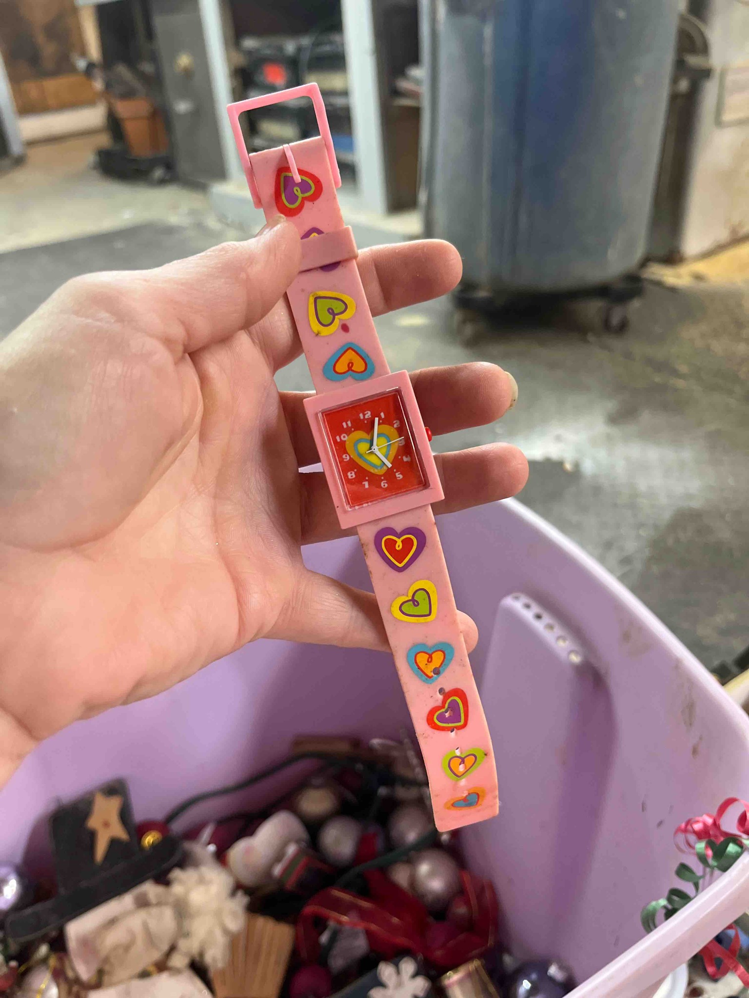 This is a children's novelty wrist watch featuring a high-saturation colorful design. The watch is constructed primarily from injection-molded pink plastic and flexible PVC or silicone for the strap. The rectangular case is pink and houses a red dial face decorated with a yellow, blue, and green concentric heart motif at the center. The dial features white Arabic numerals and white hour, minute, and second hands. A small red crown is located on the right side of the case for time adjustment. The long pink strap is embellished with a repeating pattern of stylized, multi-colored hearts in vibrant shades of purple, yellow, orange, and teal. In terms of condition, the item shows significant signs of previous use and age. There is visible surface soiling and grime accumulation across the strap, particularly near the heart graphics and edges. The plastic material exhibits some scuffing and minor discoloration (patina) consistent with a play-worn item. The movement is likely a low-cost Japanese or Chinese quartz battery-operated mechanism, though the current functional state is unknown. This style is characteristic of late 1990s or early 2000s mass-market children's accessories, emphasizing bright 'Y2K' aesthetics over horological quality. The craftsmanship is standard for budget-tier toy jewelry, using heat-welded seams for the strap and a snap-back case construction.