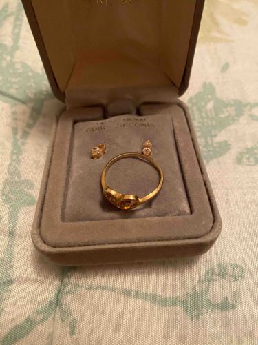 This is a jewelry set consisting of a ring and a pair of stud earrings, presented in a grey velvet-lined display box. The jewelry features a yellow gold-toned finish, appearing to be gold-plated or costume-grade metal. The ring's central motif is a stylized heart, set with a round-cut clear stone. The matching stud earrings are teardrop or pear-shaped clear stones in simple prong settings. The inner lid and base of the display box are clearly marked with 'Cubic Zirconia', indicating the stones are synthetic diamond simulants rather than natural gemstones. The ring's band is relatively thin and shows a polished finish, though there are slight surface abrasions and minor dullness to the gold plating on the shank, suggesting light previous wear. No specific hallmarks are visible in the image, but the overall style and labeling suggest a contemporary mass-market production, likely dating from the late 20th or early 21st century. The craftsmanship is standard for commercial fashion jewelry, with visible prong work holding the stones in place. The box shows standard age-related wear on the hinges and fabric lining.