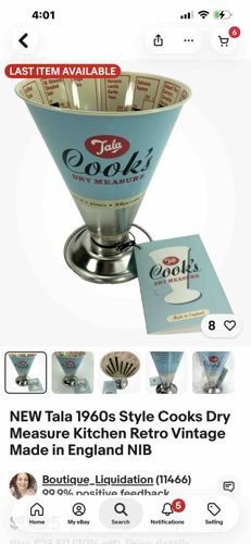 This item is a contemporary reproduction of the iconic Tala Cook's Dry Measure, designed in a 1960s retro aesthetic. The measure features a conical, funnel-shaped body constructed from tinplate steel with a polished chrome-style base. The exterior is finished in a light 'duck egg' blue and cream color scheme, prominently displaying the 'Tala' and 'Cook's Dry Measure' brand logos in stylized vintage script. Its most distinctive feature is the interior lithographed scaling, which provides specific volume measurements for various dry ingredients such as flour, sugar, lentils, and rice, allowing the cook to measure at a glance without scales. The item appears to be in 'new in box' (NIB) condition, showing no signs of use, oxidation, or wear. It includes the original paper tags and promotional materials which state 'Made in England.' The craftsmanship reflects modern manufacturing standards intended to replicate mid-century British kitchenware. This specific tool is a staple of traditional English kitchens, valued for its utilitarian charm and nostalgic design language. While it functions as a precise volume tool, it serves equally as a decorative piece for retro-themed interiors.