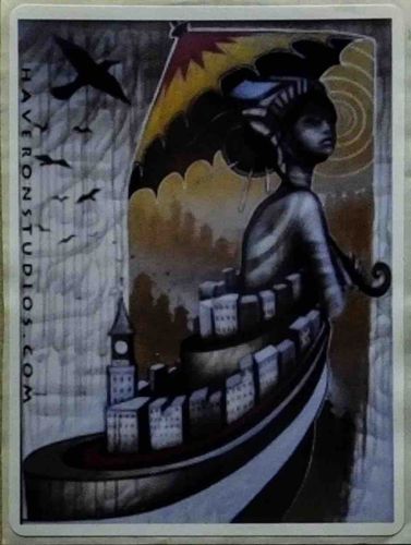 This is a large-format contemporary art print produced by Haveron Studio, measuring approximately 941 x 1247 units. The artwork utilizes a distinct dark, neoclassical-meets-surrealist aesthetic. It depicts a central feminine figure emerging from or integrated into a ship-like structure that carries a cityscape, including a prominent clock tower resembling Big Ben. The figure is shown wearing an ornate, pleated headpiece or crown beneath a large, scalloped umbrella or wing-like structure. The color palette is somber and atmospheric, dominated by sepia tones, charcoal grays, and muted yellows with pops of deep red. The background features a flock of birds taking flight against a textured, vertically-streaked sky that suggests rain or architectural blueprints. The composition is framed with a clean white border, and the maker's mark 'HAVERONSTUDIOS.COM' is clearly printed vertically along the left edge. The craftsmanship reflects modern digital or high-quality giclee printing techniques, focusing on sharp line work and smooth gradients. The condition appears fair, though the image shows some slight surface reflections and minor edge curling, typical for a large-scale unframed paper print. This piece is representative of early 21st-century illustrative surrealism.