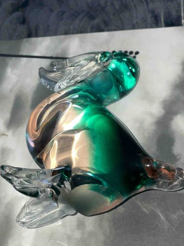 This item is a decorative hand-blown art glass figurine depicting a seated rabbit, likely produced in the mid-to-late 20th century. The piece features a complex color palette with a vibrant emerald green core cased in a thick layer of clear crystal glass. One side of the body displays an elegant, undulating 'sommerso' effect with a smoky taupe or amber-tinted swirl. The rabbit is executed in a stylized, minimalist form characteristic of Murano or Scandinavian art glass traditions. It includes long, pulled clear glass ears and small clear glass paws at the base. The construction shows high-quality craftsmanship, evidenced by the smooth, fire-polished finish and the distinct internal color banding. The base appears to be ground flat for stability, showing a slight matte texture which is typical of authentic hand-blown pieces. There are no visible maker's marks or signatures in the provided image, but the weight and clarity suggest a lead crystal composition. The item appears to be in very good condition with no visible chips or cracks, though close inspection of the base for 'shelf wear' scratches would be necessary for a full appraisal.