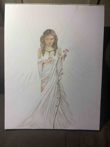 This item is an original work of art on a vertical white canvas, depicting a winged female figure, likely an angel or a botanical deity. The piece appears to be in a 'work-in-progress' state or intentionally minimalist. The central figure is rendered with colored pencils or thin-wash paints, featuring a woman with flowing brown hair, closed eyes, and a serene expression. She wears a draped, white neoclassical gown and holds a small pink flower in her left hand, while a long green vine with thorns or small leaves trails down the front of her dress. The figure is framed by light, unfinished pencil sketches of large wings extending to the edges of the canvas and a faint halo encircling her head. The palette is soft, dominated by earth tones, muted pinks, and white. The canvas itself shows some minor irregularities along the top edge, suggesting it might be an unstretched canvas sheet or a budget-grade pre-stretched frame. There are no visible artist signatures or date marks in the provided view. The style is contemporary folk-fantasy, characterized by delicate line work and a focus on ethereal subject matter. The overall condition is good, with some faint smudging or shadows near the bottom right and left edges, typical of manual drawing processes.