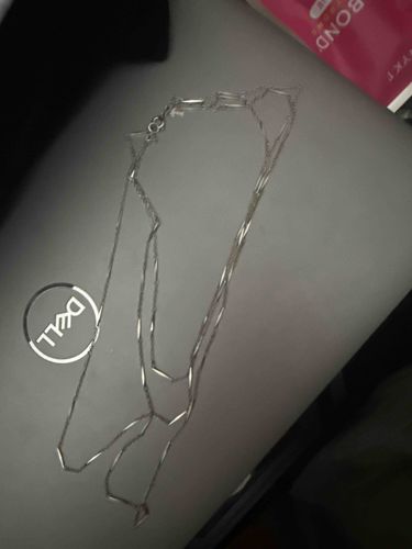 This item is a multi-strand necklace, likely crafted from sterling silver or a similar white metal, featuring a modern and minimalist design. The construction consists of several fine, delicate chains layered together. The most prominent design element is the incorporation of elongated, hexagonal or tubular bar links interspersed with traditional round-link chain segments, creating a shimmering geometric texture. The necklace is secured with a small metal spring ring clasp, which appears functional and appropriately scaled for the weight of the piece. In terms of physical characteristics, the cool-toned metal exhibits a bright, reflective finish consistent with high-polish silver. The craftsmanship suggests a contemporary aesthetic, likely from the late 20th or early 21st century. While no clear hallmarks are visible in the photograph, the uniform construction and neat soldering points indicate professional manufacture. Regarding condition, the necklace appears well-preserved with no obvious kinks, breaks, or significant tarnishing, although minor surface scratches typical of light wear may be present upon closer inspection. The overall style is versatile and lightweight, designed for everyday wear or layering.