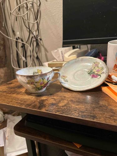 This is a two-piece vintage teacup and saucer set featuring a distinctive lusterware glaze. The set is crafted from thin-walled porcelain or ceramic, characteristic of mid-20th-century decorative teaware. The most striking physical feature is the iridescent, pearlescent 'mother-of-pearl' finish that covers both the interior and exterior surfaces, giving it a metallic, rainbow-like shimmer. The exterior of the wide-mouthed cup and the face of the saucer are decorated with transfer-printed floral motifs, primarily vibrant yellow daffodils and pinkish-purple roses with green foliage. The rim of the cup and the edge of the saucer appear to have a sponged or worn gold-gilt border. The cup features a small, simple loop handle. In terms of condition, there is significant visible wear to the gilded edges (rubbing) and potential minor crazing consistent with age. This style is most commonly associated with Japanese imports from the 1940s-1960s (often marked 'Made in Japan' or 'Occupied Japan'). The craftsmanship is typical of mass-produced collectible giftware of that era, valued more for its kitsch aesthetic and light-catching finish than for high-end luxury marksmanship.