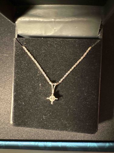 This fine jewelry item consists of a single round-cut colorless stone, likely a diamond, mounted in an intricate pendant setting and suspended from a delicate rope-style metal chain. The metal appears to be white gold, platinum, or high-polished silver, exhibiting a bright, reflective luster typical of precious metals. The pendant features a unique design where the central stone is secured by four primary prongs, which are integrated into a larger 'compass-point' or cruciform accent. Four smaller spherical metal beads or accent stones are positioned at the cardinal points around the main gem, creating a starburst or cross-like visual effect. The pendant is attached to the chain via a polished, wishbone-shaped bail that adds structural elegance. The chain itself is a fine-gauge rope link, suggesting a modern or contemporary style period from the last 20-30 years. The item is presented in a black velvet-lined presentation box with a hinged lid. Condition appears to be excellent with no visible tarnishing or missing components, indicating well-maintained craftsmanship. While no maker's marks are visible in the photograph, the precision of the setting and the uniformity of the chain links point to a professional level of jewelry manufacturing.