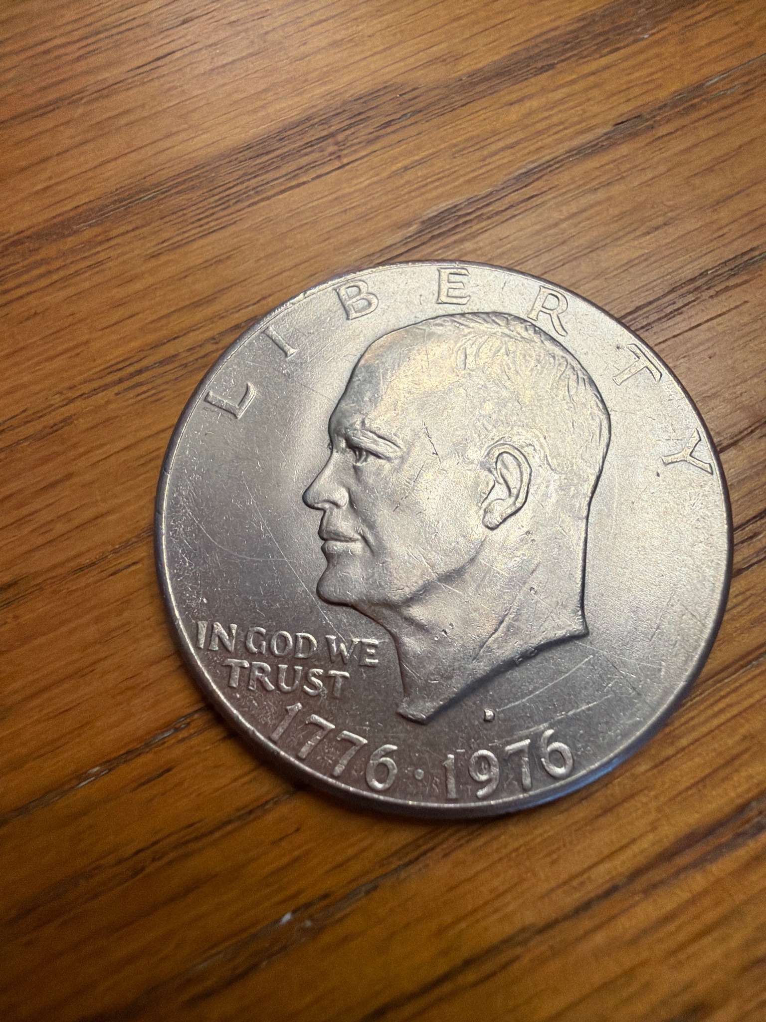 This is a 1776-1976 United States Bicentennial Eisenhower Dollar coin. The obverse features a profile of President Dwight D. Eisenhower facing left, designed by Frank Gasparro. Above the profile is the word "LIBERTY" and below is the dual date "1776-1976". The phrase "IN GOD WE TRUST" is located to the left of Eisenhower's neck. This circulating commemorative coin has a diameter of 38.1 mm and is likely composed of a copper-nickel clad copper core, though 40% silver versions were also produced for collectors. The coin displays a light metallic silver color with a dull satin-like luster. Visible condition issues include several minor surface scratches, contact marks (bag marks), and slight wear on the higher relief points of Eisenhower's hair and jawline, suggesting it has seen some time in circulation. There is no visible mint mark on the obverse above the date, which typically indicates it was struck at the Philadelphia Mint. Significant to the American Bicentennial, these coins were minted in 1975 and 1976 to celebrate the 200th anniversary of the United States.