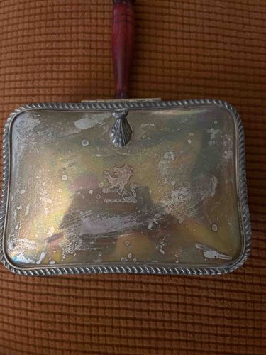 This is an antique silent butler, also known as a table crumber, typically used for clearing crumbs and ash from a dining table. The piece features a rectangular hinged lid with a decorative gadrooned or rope-twist border and a central heraldic crest depicting a rampant lion. The construction utilizes silver-plated copper or brass, evidenced by the significant 'bleeding' where the underlying base metal is visible through the worn silver plating. A distinctive shell-shaped thumb lift facilitates opening the lid. The handle is crafted from a dark, reddish-toned turned wood, likely mahogany or stained beech, secured by a metal ferrule. The condition shows heavy patina, oxidation, and extensive surface wear consistent with age and regular use. The overall style is reminiscent of Victorian or early 20th-century English silverplate, designed for formal domestic service. There are no clearly visible maker's marks from this angle, but the craftsmanship of the chasing and the heraldic engraving suggests a mass-produced yet quality household item from the late 19th to early 20th century.