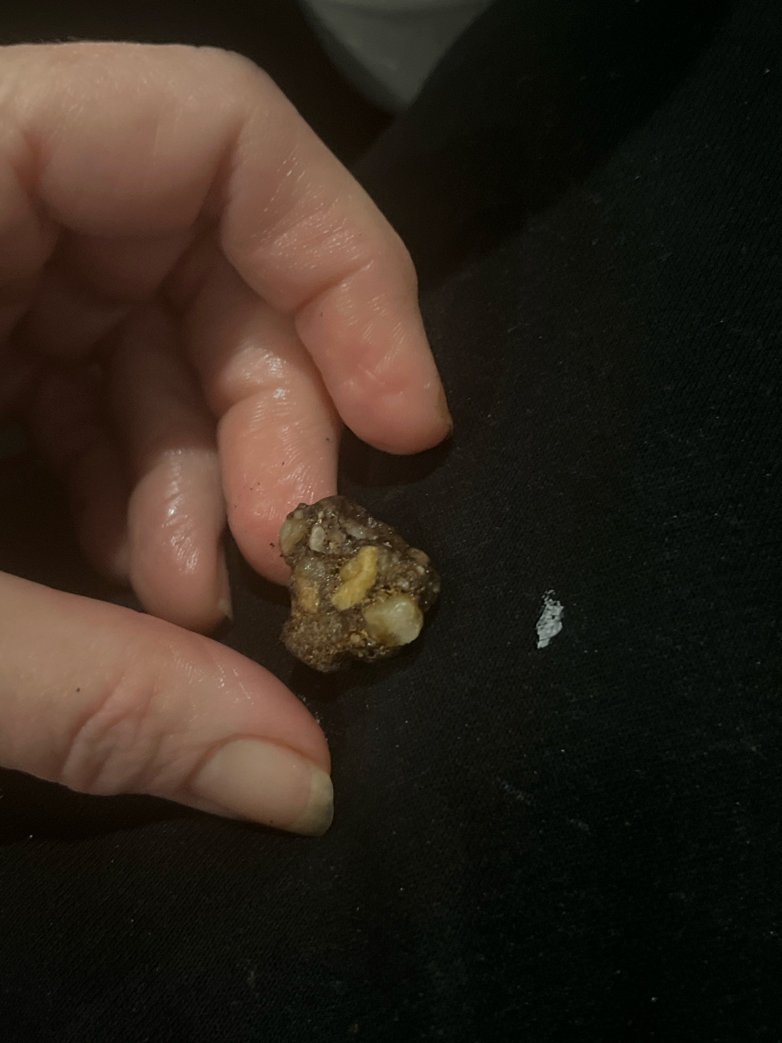 This item is a small, natural geological specimen measuring approximately 1 to 1.5 centimeters in width. It exhibits the characteristics of a conglomerate sedimentary rock, consisting of various smaller mineral fragments and rounded clasts naturally cemented together within a dark, fine-grained matrix. The colors ranging from dark brown and earthy chocolate tones in the sandy matrix to pale yellow, ivory, and translucent white within the larger, embedded inclusions. These inclusions appear to be weathered quartz or quartzite pebbles, displaying a semi-translucent quality and smooth, water-worn edges. The overall shape is irregular and sub-angular, indicating natural fragmentation rather than intentional lapidary shaping. The surface texture is rough and gritty where the matrix is exposed, contrasting with the smoother faces of the larger mineral grains. There are no man-made markings, signatures, or historical engravings visible. The condition appears stable with natural weathering and minor surface debris likely from its discovery site. Such specimens are typical of riverbed or glacial deposits where varied mineral materials are compressed over geological timescales. The craftsmanship is entirely natural, resulting from sedimentary processes rather than human intervention. There is a small white powdery residue visible on the background fabric nearby, though its relation to the rock cannot be confirmed without further chemical testing.