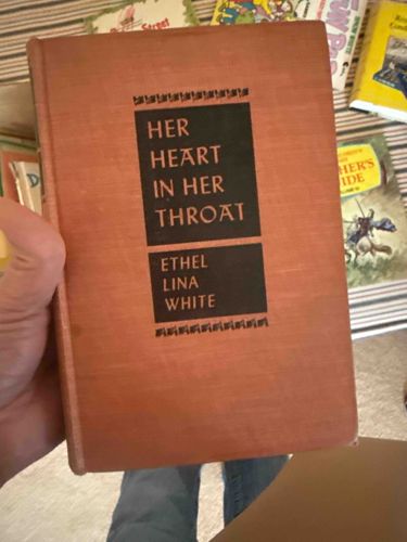 This is a vintage hardcover edition of the mystery novel 'Her Heart in Her Throat,' authored by Ethel Lina White. The book is bound in a textured reddish-orange or rust-colored cloth. The front cover features a distinctive graphic design consisting of two black rectangular blocks containing the title and author's name in a sans-serif, metallic-gold or light-colored font. Decorative black geometric borders accent the top and bottom of these blocks. The spine shows visible wear with some fraying at the head and tail, and the cloth covers exhibit mild surface soiling and rubbing, particularly along the edges and corners. Based on the publication history of this title and the specific typography and binding style, this copy appears to be a mid-20th-century printing, likely from the 1940s (the original was published in 1942). The craftsmanship is typical of mass-market hardbacks of the era, utilizing a sturdy cloth-over-board construction. There is no dust jacket present, which is a significant factor in its condition assessment. Ethel Lina White was a noted British crime writer best known for 'The Wheel Spins,' which was adapted into Hitchcock's 'The Lady Vanishes.'