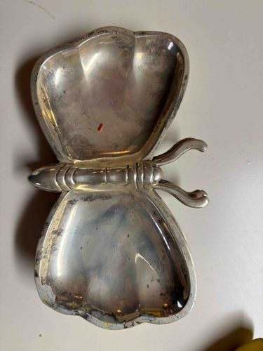 This is a decorative metal trinket dish or candy bowl designed in the whimsical shape of a butterfly, likely manufactured by Godinger Silver Art Co. during the late 20th century. The piece is constructed from a heavy base metal, commonly brass or zinc alloy, which has been finished with a lustrous silver plating. The butterfly's wings serve as dual shallow basins, featuring subtle scalloped edges that mimic the natural contours of lepidopteran wings. The central body consists of a cylindrical, segmented torso with a rounded head and four curling antennae extending from the side, which double as small handle-like decorative elements. The item shows significant signs of age and wear; there is noticeable tarnish and oxidation across the interior surfaces, along with localized pitting and instances where the silver plating has thinned or worn away, particularly along the rim and base. A small orange-red mark is visible in the upper wing basin, which may be a remnant of a surface stain or price marking. The overall craftsmanship is industrial-grade decorative ware, consistent with the mass-produced vintage giftware style popular in the 1980s and 1990s.