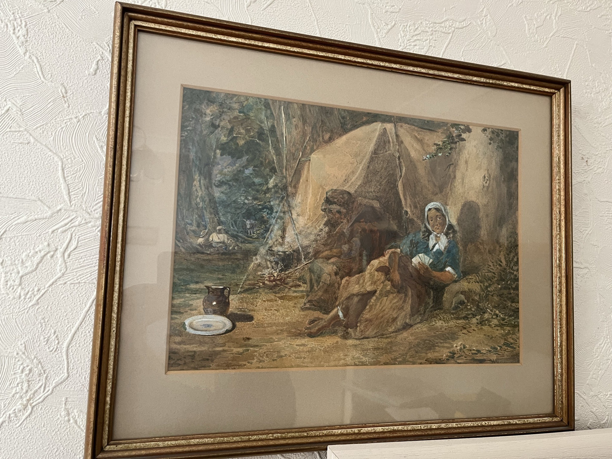 This is a 19th-century watercolor and gouache painting on paper, framed under glass. The scene depicts a Romani or 'gypsy' encampment, a popular romanticized theme in Victorian-era British art. Two central figures are featured outside a tent: a woman in a blue bodice and light headscarf holding a deck of cards (suggesting fortune-telling), and a seated man in dark, rustic clothing. The background shows a wooded area with further figures and a cooking pot over an open fire. In the foreground, a detailed still life of a ceramic pitcher and plate is visible. The artistic style is loose and atmospheric, utilizing a palette of earth tones, deep blues, and muted greens. The work is housed in a carved gilt-wood frame with an inner beige matting. There is evidence of foxing (small brown spots) on the paper, particularly in the lighter upper quadrants, and some mild acid-curing or staining from the original wood backing. The frame shows minor surface wear and loss of gilding on the corners, consistent with an age ranging from the mid-to-late 1800s. No signature is immediately visible in the lower corners, which may be covered by the matting. The quality of the anatomical rendering and the light-play indicates a skilled academic painter or a highly proficient amateur of the period.