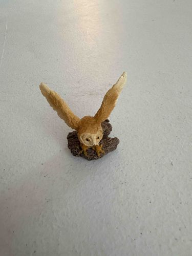 This item is a small-scale decorative figurine depicting a Barn Owl (Tyto alba) in a dynamic landing or defensive posture with wings outspread and talons forward. The figurine is constructed from cast resin, a synthetic material that allows for high levels of textured detail, imitating natural feathers and organic bark. The color palette features warm ochre, cream, and beige tones on the plumage, with a darker brown wash applied to the sculpted base to simulate a rugged log or branch. Notable features include the characteristic heart-shaped facial disk of the barn owl species, rendered with subtle indentation and dark amber-colored eyes. The craftsmanship suggests a mass-produced collectible from the late 20th or early 21st century, often found in 'nature' or 'bird-lover' gift sets. Condition appears excellent with no visible chips to the delicate wing tips or beak. There are no obvious maker's marks visible from this angle, though such items often carry a molded stamp or adhesive label on the flat underside of the base. The piece exhibits a matte finish, typical for resin castings intended to look like hand-carved wood or stone.