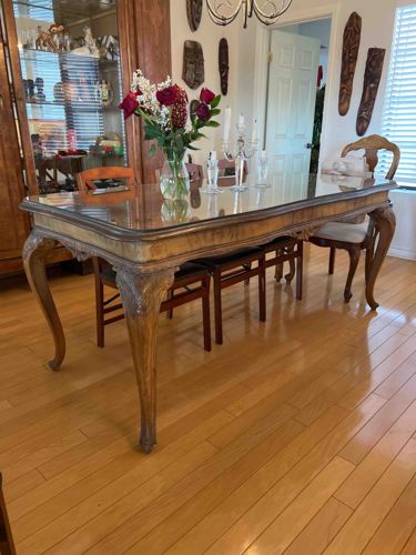 French Provincial Style Carved Wood Dining Table with Glass Top