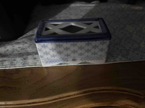 This is a small rectangular ceramic vessel, likely a flower frog, bough pot, or incense burner, featuring a traditional blue and white aesthetic. Constructed from glazed porcelain or earthenware, the item measures approximately 3-4 inches in length and 2 inches in height. The top surface consists of a lattice-work pierced lid with diamond-shaped openings, allowing for the insertion of stems or the release of smoke. The body is decorated with a transfer-printed or hand-painted lattice and floral starburst pattern on the sides, capped with a thick cobalt blue border along the upper rim. The bottom edge is uniquely scalloped, forming four small feet. The style is reminiscent of 19th-century chinoiserie or Delftware, though the crispness of the pattern suggests a mid-20th-century reproduction. Condition appears good with a bright glaze and no visible major cracks, though there is minor surface dust and possible slight kiln debris characteristic of mass-produced studio pottery. The craftsmanship shows consistent symmetry in the pierced top, indicating a molded manufacturing process.