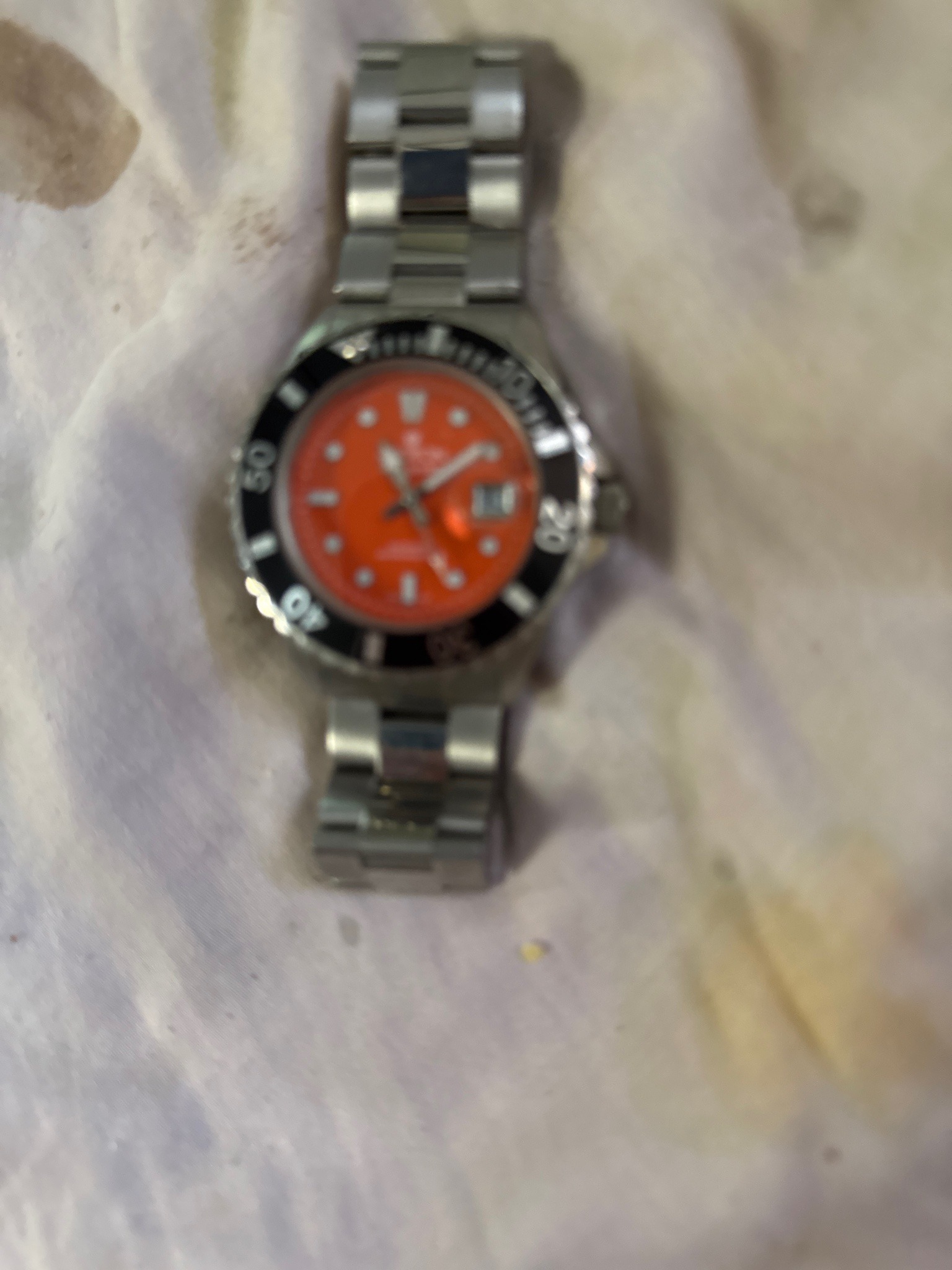 This is a men's stainless steel divers watch, featuring a striking and vibrant orange dial, a characteristic often associated with professional diving instruments for high visibility underwater. The watch is constructed with a robust brushed stainless steel case and a matching Oyster-style three-link bracelet. It features a unidirectional rotating black bezel with silver-toned 60-minute graduation markings and a luminous pip at the 12 o'clock position. The dial displays prominent luminous round and rectangular hour markers and oversized hands, including a date window at the 3 o'clock position. The overall design language, including the crown position and case shape, suggests it belongs to the Seiko SKX or similar vintage diver series from the late 20th to early 21st century. The condition appears well-worn with visible scuffing and scratches on the bracelet and case, indicating regular use. The crystal shows some minor hazing. While the image is slightly out of focus, the craftsmanship points to a durable, high-quality tool watch intended for aquatic sports, though its current water resistance would need testing due to age.