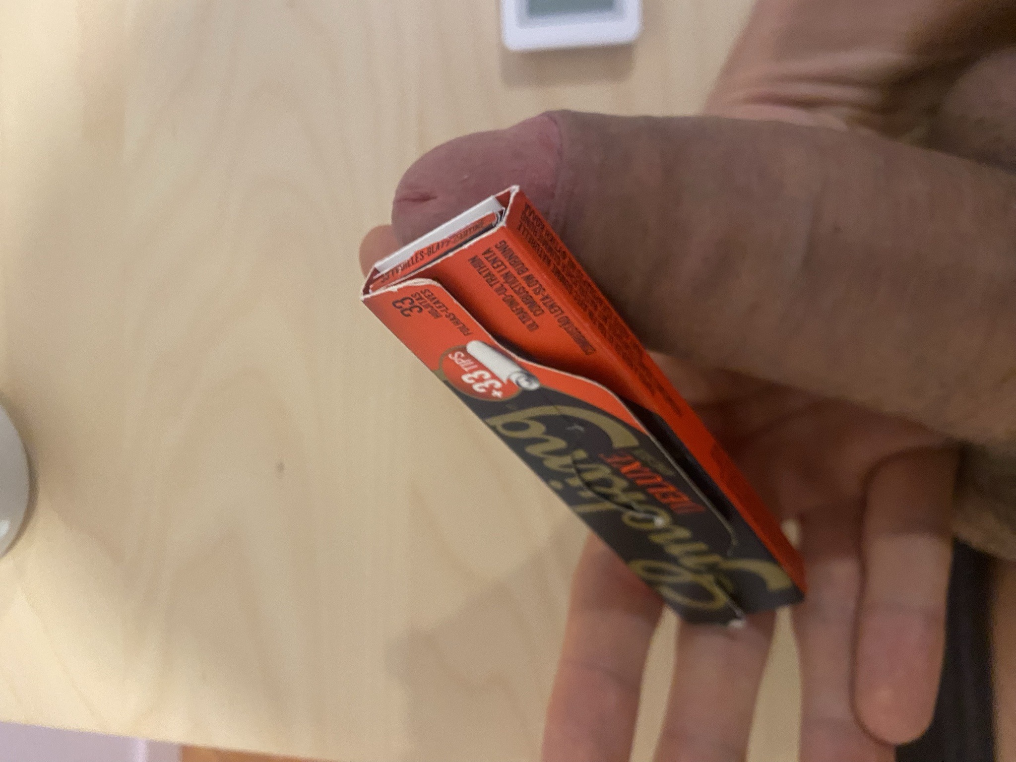 This item is a retail pack of Smoking brand Deluxe rolling papers, featuring an integrated compartment containing 33 filter tips. The packaging consists of a folding cardboard booklet with a distinctive black, gold, and red color scheme. The branding 'Smoking Deluxe' is printed in a stylized, cursive gold font against a black background on the front flap. The side panel is a vibrant red and displays technical product specifications in multiple languages, including 'Ultra Thin', 'Slow Burning', and '33 Leaves/Tips'. The construction is typical of mass-produced tobacco accessories, utilizing thin cardstock and light adhesive. The physical condition shown suggests regular use; there is visible creasing at the hinge, softening of the cardboard edges, and slight deformation of the package shape from being handled or carried. This specific configuration, combining both paper leaves and cardboard tips in a single booklet, is a modern convenience design widely distributed in the 21st century. The craftsmanship is professional-grade commercial printing, and there are no signs of aftermarket repair. Notable hallmarks include the '33' leaf count and the signature logo of the Spanish manufacturer Miquel y Costas.