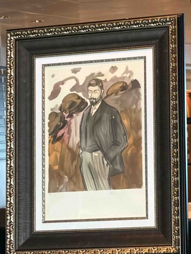 This item is a framed lithograph after Salvador Dali, specifically from the 'Les Vitraux' suite, depicting a bearded man in 19th-century attire, which may represent a historical figure or literary character. The artwork features Dali's signature surrealist-influenced color palette with earthy browns, ochres, and purples arranged in fluid, abstract background shapes. The figure is rendered with confident, expressive linework. The piece is house in a high-quality, contemporary composite frame with a dark wood-grain finish and ornate gilded scrollwork detailing along the inner and outer perimeters. It is professionaly matted with a crisp white archival mat and a decorative gold-toned inner fillet that echoes the frame's ornamentation. Visible at the bottom of the print is what appears to be a pencil signature on the right and a numbering or edition mark on the left (e.g., E.A. or a fraction), which are common in Dali's later graphic works from the 1970s. The overall condition appears excellent with no visible foxing, buckling, or fading, suggesting it has been kept in a light-controlled environment under protective glass. The craftsmanship of the presentation highlights the piece as a significant decorative work by a master of 20th-century art.