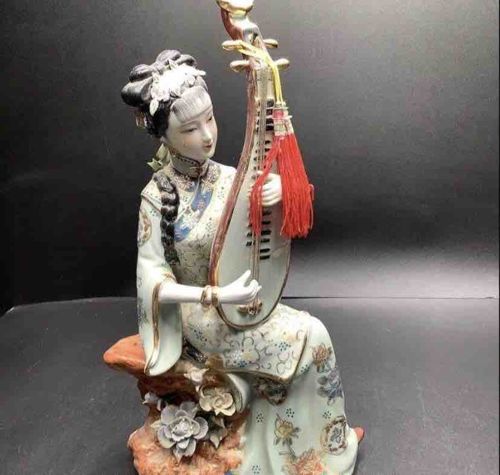 Famille Rose Polychrome Porcelain Figurine of a Lady Playing a Pipa
