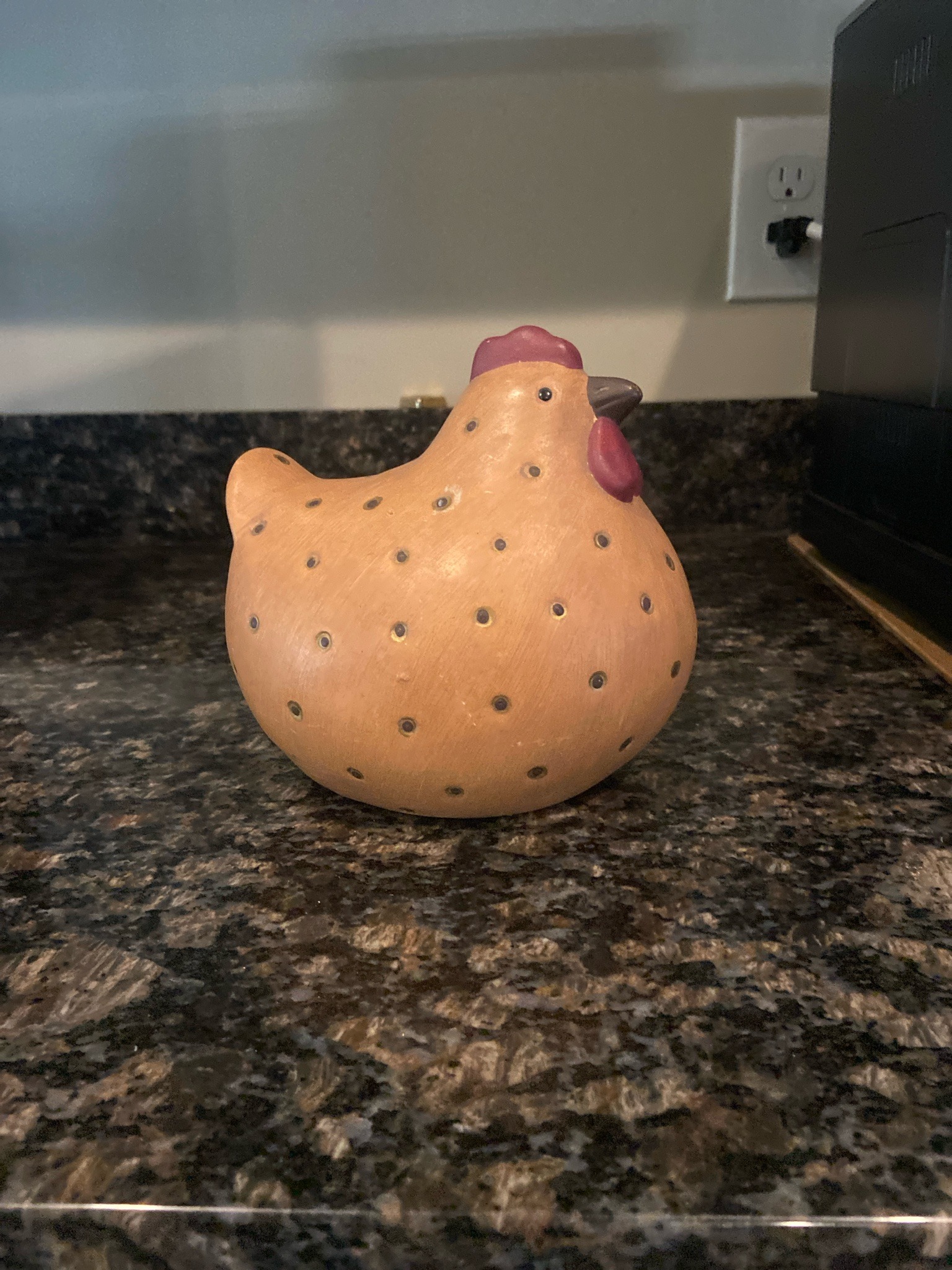 This is a stylized, rounded ceramic figurine of a hen, characterized by a bulbous, teardrop-shaped body and a minimalist aesthetic. The piece is crafted from a matte-finished terracotta or earthenware ceramic, featuring a primary color palette of warm peachy-orange or tan. The body is decorated with an all-over pattern of small, hand-painted dark blue or charcoal grey polka dots, which are accented with tiny golden centers. The hen's anatomy is simplified: it features a small, upturned tail, a subtle head with a prominent burgundy-colored comb and wattle, and a small, dark beak. The eyes are rendered as simple black dots. The surface texture appears smooth but non-reflective, indicating a matte glaze or cold-painted finish. In terms of condition, there are visible surface scuffs and minor paint loss, particularly on the rounded flanks and the back, which suggest handling and age. Small white specks are visible throughout the darker dots, which could be intentional design elements or minor chipping of the top layer of paint. Based on its folk-art-inspired style, it likely dates from the late 20th century to the early 2000s and was intended as a decorative kitchen or farmhouse-style home accent. The construction is hollow, likely slip-cast, and lacks visible maker's marks from this angle.