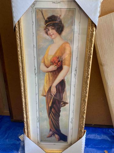 This item is a framed vertical print featuring a full-length portrait of a young woman dressed in early 20th-century 'flapper' or Edwardian-era fashion. The subject is depicted with dark wavy hair adorned with an ornamental headband and feather, wearing a shimmering golden-yellow wrap over a long, dark brownish-purple draped skirt. She holds a bouquet of red roses and a closed hand-fan. The artwork style is reminiscent of early calendar art or 'yard long' prints popular in the 1910s and 1920s. The image is housed in an ornate, gold-toned (likely gesso or wood with metallic finish) frame featuring floral scrollwork and beaded borders. It is protected by glass and includes a decorative inner mat with line-work borders. The print appears to have an artist's signature or brand mark in the lower-left corner, which is common for commercial illustrators of that period. Physically, the item is tall and narrow with a rectangular orientation. The condition appears to be excellent, with the frame protected by white cardboard corner guards, suggesting it has been well-preserved or recently rehoused. The colors remain vibrant without visible fading, and the frame shows no significant chips or cracks. This piece reflects the romanticized illustrative style of the Art Nouveau to Art Deco transition period, characterized by soft palettes and elegant feminine subjects.