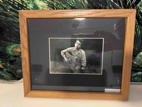This item is a black and white photographic print depicting a young Bob Dylan seated and playing an acoustic guitar. The photograph captures the musician in a candid, contemplative pose, likely dating to his early years in Greenwich Village, circa 1961. The print is centered within a wide, dark grey or black mat board, which is housed in a light-toned oak or wood-effect frame. A small white identification label is affixed to the bottom right of the mat, reading 'BOB DYLAN, NEW YORK CITY 1961'. The frame appears to be a standard contemporary gallery-style frame with mitered corners. Physically, the piece shows some signs of particulates or dust under the glass, and there is a noticeable reflection on the glass surface indicating it is not non-reflective museum glass. The print itself has a white border around the central image. There are no readily visible signatures or photographer credits on the front beyond the printed text label. The frame exhibits a natural wood grain texture with a light varnish. Condition is generally good, though the mounting appears informal. This piece serves as a significant cultural touchstone representing the folk-rock movement of the early 1960s.