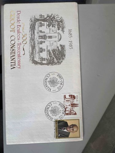 This is a philatelic First Day Cover (FDC) commemorating the 300th anniversary (tercentenary) of the Groot Constantia wine estate in South Africa, dated April 2, 1985. The white rectangular envelope features a textured linen-like finish. On the left, it displays a decorative cachet with a sepia-toned illustration of the historic Cape Dutch manor house framed by trees, accompanied by elegant typography in gold and maroon reading '300 Derde Eeufees Tercentenary GROOT CONSTANTIA 1685-1985'. Two postage stamps are affixed: a 1c RSA stamp depicting a historic building and a 1k RSA stamp featuring a portrait of P.W. Botha. Both stamps are cancelled with a special circular 'CONSTANTIA' postmark dated '1985-04-02' that incorporates a grape cluster motif, symbolizing the estate's viticultural heritage. The item appears to be in excellent collectors' condition with crisp edges, no visible Foxing, and clear, bold strikes of the cancellation mark. The craftsmanship of the printing shows high-quality gold foil and multi-tonal ink application typical of mid-1980s official South African Postal commemoratives.