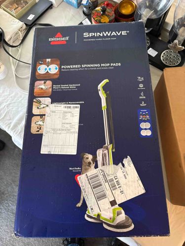 This item is a BISSELL SpinWave Powered Hard Floor Spin Mop, still contained within its original commercial retail packaging. The mop unit featured on the box art is constructed from durable white and lime green plastic with a chrome-finished metal extension wand. It features an ergonomic handle and a low-profile power head designed with dual rotating microfiber pads for scrubbing surfaces like sealed hardwood, tile, and linoleum. Notable features include an on-demand spray trigger for moisture control and a removable water tank. The external cardboard packaging is primarily a deep blue color with high-gloss graphic prints showcasing the product's functionality and included accessories, which typically include cleaning solutions and spare mop pads. Regarding condition, the retail box exhibits visible wear, including frayed edges, minor crushing at the corners, and multiple adhesive shipping labels—one of which is partially torn and obstructing the lower graphic. There is also evidence of liquid spotting or moisture staining on the bottom-left surface of the box. These condition issues relate specifically to the exterior container; the structural integrity of the internal appliance cannot be verified without opening. The item represents modern household cleaning technology from the late 2010s to early 2020s, manufactured by BISSELL Homecare, Inc.