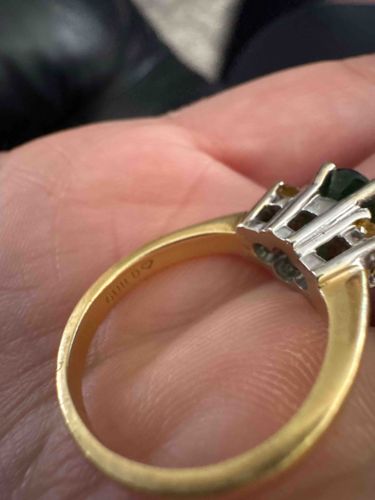 This item is a trilogy-style gemstone ring featuring a prominent central green stone, likely an emerald or dark sapphire, flanked by two side stones. The piece is constructed with a dual-metal design typical of the late 20th century, featuring a classic yellow gold band integrated into a white metal (likely platinum or white gold) multi-prong setting for the head. The interior of the gold shank displays clear hallmark stampings, including '750' indicating 18-karat gold purity, accompanied by a maker's mark or assay office symbol. The craftsmanship exhibits a sturdy, high-profile gallery designed to maximize light entry into the stones. In terms of condition, the gold band shows multiple fine surface scratches and minor abrasions consistent with regular daily wear and age. The white metal setting appears intact with no broken prongs visible, though the overall metal surfaces could benefit from professional polishing to restore the original luster. The stones appear securely set, and the ring maintains a classic, elegant aesthetic suitable for an anniversary or engagement piece.