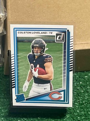 This is a Donruss brand 'Rated Rookie' football trading card featuring tight end Colston Loveland. The card displays standard modern trading card dimensions, approximately 2.5 by 3.5 inches, constructed from semi-glossy cardstock. The design features a white border surrounding a multi-layered blue and teal frame that houses a central action photograph of Loveland in a navy blue and white football uniform, holding a football. The player is depicted with a matte finish that contrasts slightly against the field background. Notable markings include the Donruss 'D' logo in the upper right, the 'Rated Rookie' blue banner in the bottom left, and the Chicago Bears 'C' logo in the bottom right corner. The text at the top identifies the player as 'COLSTON LOVELAND • TE'. The card appears to be in excellent condition, housed within a clear protective plastic sleeve and displayed on a stand. Centering seems well-aligned horizontally, though the bottom border appears slightly thicker than the top. No visible surface scratches, corner softening, or edge chipping can be seen through the protective layer, suggesting a near-mint status. This card represents a modern 'fantasy' or custom-style rookie card creation, as Colston Loveland is a collegiate player and the uniform features professional team markings, typical of recent unlicensed or custom artistic sports memorabilia.
