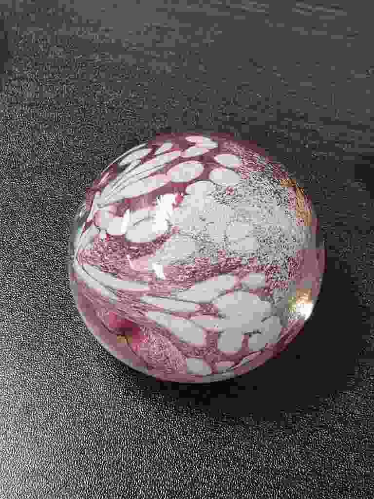 This is a spherical art glass paperweight featuring a dense interior decoration of mottled pink and white opaque glass. The piece is constructed from clear solid glass with internally encased colors, exhibiting a 'splatter' or 'frizz' design. The white elements appear as irregular, ovate spots or splotches, while the pink elements range from a light dusty rose to a deeper magenta, creating a textured, layered visual effect within the orb. The surface is polished and smooth, reflecting light with high clarity, which suggests a high lead content or quality crystal base. There are no immediately visible maker's marks, signatures, or pontil scars in the provided image, though such marks are often found on the flat base of such items. The style is reminiscent of mid-to-late 20th-century studio glass, possibly of Murano or Bohemian origin. The condition appears excellent with no visible chips, cracks, or deep abrasions, though minor surface scratches consistent with shelf wear may be present on the underside. The craftsmanship is evident in the even distribution of the color fragments and the lack of large internal air bubbles, which are common flaws in lower-quality glass production. The overall aesthetic is organic and fluid, typical of decorative glass spheres produced in the 1970s through the 1990s.