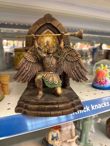 This is a contemporary decorative figurine depicting the Archangel Gabriel. The statue is constructed from cast resin with a faux-bronze and cold-cast metallic finish. Gabriel is shown in a kneeling warrior pose, wearing detailed Roman-style plate armor and a segmented skirt with green and gold highlights. He holds a long, ornate trumpet above his head with both hands. His wings are large and feathered, extending outward to frame the central figure. Behind the angel is a Gothic-style arched backdrop featuring a faux-stone texture and a decorative inset that appears to represent a stained-glass or luminous divine scene. The figure rests on a tiered, rectangular plinth base that is prominently inscribed with 'ST. GABRIEL' on the front. The overall craftsmanship suggests a mass-produced collectible item, likely from the late 20th or early 21st century. The condition appears excellent with no visible chips, cracks, or significant wear to the faux-patina finish, though slight dust accumulation is present in the recessed areas of the wings and armor. The style combines traditional religious iconography with modern fantasy-art aesthetics, characterized by its bronzed coloration and high-relief detailing.