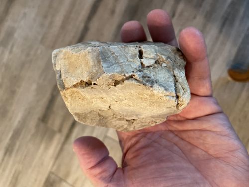 This is a Paleolithic-era stone tool, specifically a bifacial hand axe that likely served multi-purpose functions as a scraper and hammer. Measuring approximately 4.5 inches by 3 inches, the item is crafted from chert, a hard, sedimentary rock known for its predictable fracturing properties suitable for knapping. The color palette consists of earthy tans, creams, and grayish-white tones, with some darker inclusions and internal mineral veining visible. The piece exhibits characteristic percussion flaking along its edges, indicating intentional shaping by a human hand to create a usable grip and a functional working edge. The surface shows a significant degree of natural patina and weathering, with some areas appearing polished by centuries of soil exposure or handling. There are visible step fractures and smaller hinges, typical of ancient lithic technology. The tool features a thick, robust center tapering to thinner edges. Condition-wise, it shows ancient wear consistent with its age, including minor chips and abrasions that have been smoothed over time by natural processes. No modern tool marks or signatures are present, which is consistent with its origin as an early prehistoric artifact. The craftsmanship displays a functional mastery of lithic reduction, designed for durability and ergonomic use within a hunter-gatherer context.